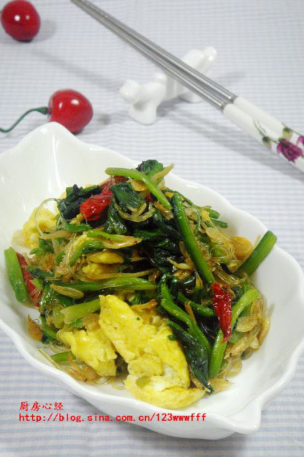 1. 菠菜焯水后,过凉水并挤干水分备用,鸡蛋炒熟备用,粉丝用凉水泡20分钟沥干水备用。姜丝;干辣椒备用