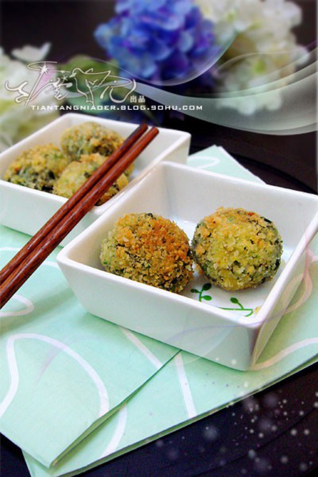 入六分热的油锅中,中小火将其菠菜球炸成金黄捞出即可
