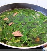 五、菠菜富含铁,有较好的生血止血作用;猪肝能补肝养血。两者同用,共具养血补虚之效,对各种贫血症有较强的滋补食疗作用。
