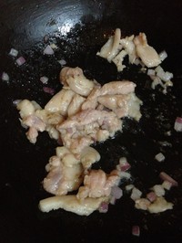 2. 锅中倒油放入洋葱呛锅,倒入腌制好的肉片翻炒~