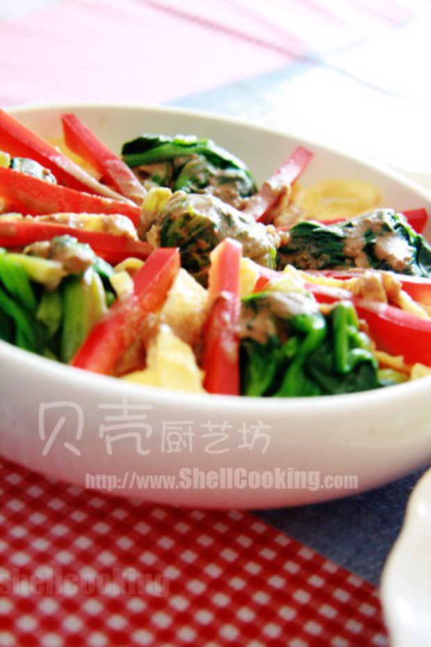 菠菜团子、彩椒丝、鸡蛋丝码盘,淋上搅拌好的酱汁,最后淋上麻油即可