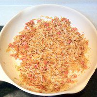 腊肠或香肠切丁,与虾皮一同入油锅爆香,加入少许盐调味,如果不喜欢太咸可以不加,虾皮本身已经是咸的。炒好盛起备用。