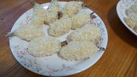 8. 虾先在鸡蛋液里滚一圈,再在面包糠里滚一圈