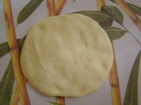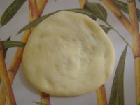 取一个面团,轻轻压扁,成圆形片。