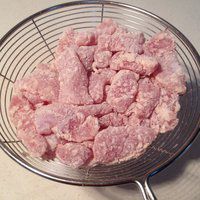 2. 腌制好的里脊肉先撒入一點面粉,粘滿每個肉條再簿薄撒一層生粉使每根肉條分離,再將多余的粉用篩子篩掉