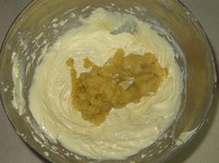 将香蕉用擀面棍砸碎成粒粒状,再用香蕉酒伴匀(也可以打成泥状,但发觉打成泥状会容易变黑),倒入乳酪糊里,拌匀。