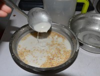 先用250ML水把马蹄粉开好.一直搅拌.直到没有沉淀物粒粒为止.再加上250ML水.50克糖搅拌.搅好后加桂花.再搅拌.