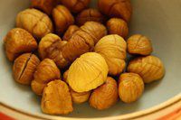 剥完壳的光溜溜的栗子,放在水中煮1、2分钟。如果直接就用的是熟的糖炒栗子,就不用煮了。
