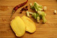准备好生姜2片、葱白若干、花椒数粒、干辣椒1个。