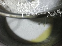 蛋白加柠檬汁打至粗泡,分三次加入30克白砂糖,打至硬性发泡