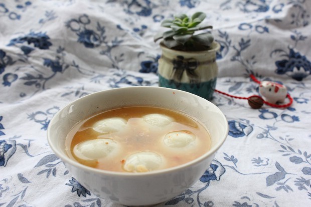 自己用糯米、枸杞、红枣制作的酒酿,出来之后是橙红色,酸甜可口,加上汤圆,立刻又找到了南方小镇的风味。