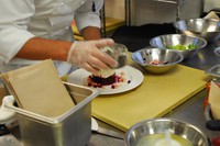 青苹果丁和剩余甜菜丁,加醋油沙司。用作盘子点缀。垂直拿起模具。