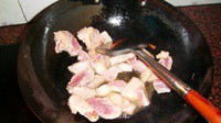 然后倒入猪肉,尽量把它平铺,慢慢煎,等肉变色就可以先去开电饭煲预热了~