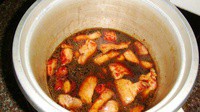 然后把肉转入电饭煲,倒入少许刚刚的热油,放入煎炸好的蒜瓣,先倒入黄酒,以稍微盖过肉为宜,再放生抽老抽,盐,一点点糖,然后盖盖开始烧。