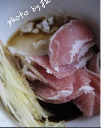 瘦肉切片用生抽和姜丝腌渍10分钟备用