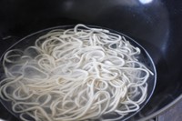 然后开火~把一小撮的面条放入锅中的水里焯一下~不用很久1-2分钟足够。焯过的面有一定的湿度比较方便用来炒面。