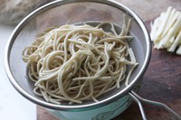 然后用筷子捞出来放在滤水勺里用冷开水冲洗一下,用筷子搅拌一下,防止底部面条粘住。这一步是为了防止焯过的面粘在一起。