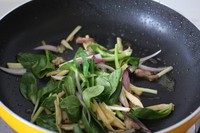 然后再放入青菜和洋葱一起炒,洋葱后放是因为这样口感会比较脆,这个时候同时可以倒入酱油,然后接着炒。