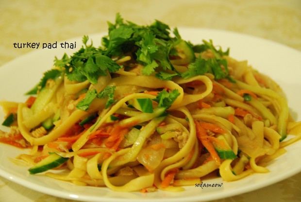 上次烤了个大火鸡,8个人只吃了半只,剩下的我和兔牙哥吃了整整4天……其中两天只是微波炉加热一下,后两天我把火鸡肉都拆了下来,再次加工做其它菜了,其中一道就是PadThai(应为泰式炒粉,但我用的是面)。这边的洋人非常喜欢点PadThai吃,每次在快餐厅里看到在泰餐面前排长队的都是金发碧眼的……也许这和中餐一样,洋人们吃的总和自家里做的不太一样吧。摘改自foodnetwork之TurkeyPadThai,4人份。turkey-pad-thai-recipe/index.html