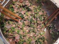 2. 放入切好的荠菜,加入盐,少许胡椒。搅拌上劲。