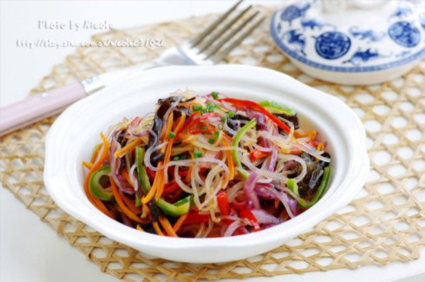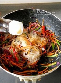另起锅,入少许油,油烧热后放入五彩丝翻炒