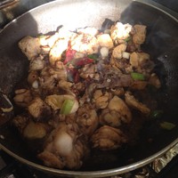 拿深一点的炒锅,热锅,放油,油热了以后放适量糖,把糖炒化后放葱姜蒜,辣椒和花椒,炒出香味后把鸡放入翻炒半分钟