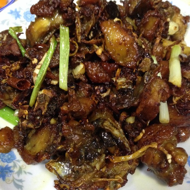 把锅内多余的鸡油倒出,留在锅内的油合适炒菜的量就可以了,放入姜丝,干辣椒,待干辣椒炒至发光发亮的时候倒入少许料酒加盖焖一分钟,再放入一勺白糖,蚝油和蒜米葱头一起翻炒直至蚝油吸收