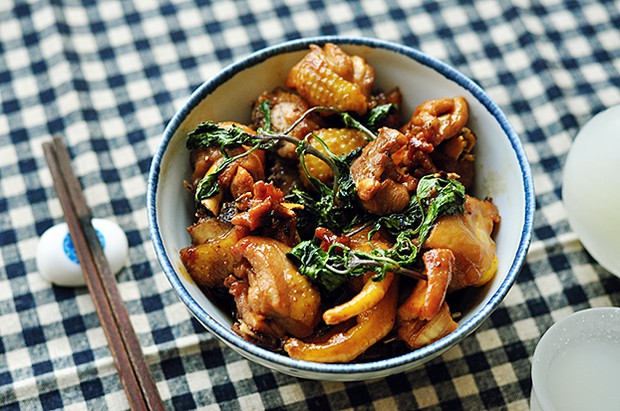 麻油下锅热了以后倒入鸡块翻炒一下,然后倒入三杯调味品,米酒稍微多点。不用再放水了。翻炒以后加入九层塔,盖上锅盖烧到汁水浓稠就差不多了好了。盛出来吃吧。