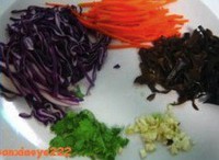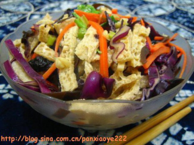 1. 木耳用开水炒熟.将脆豆腐、紫甘蓝、胡萝卜、木耳切丝.脆豆腐本身就是熟的可以直接食用
