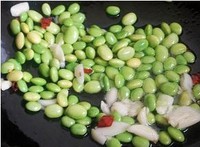 加入洗净的毛豆快炒,将毛豆翻炒的七成熟