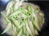 毛豆要先下锅炒,因为比丝瓜熟的慢丝瓜虽然含水量大,但是不加盖水份挥发快,所以要适当加一些水