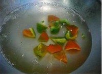 红椒洗净切滚刀块,用加了盐的开水飞过