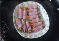 培根一分为二,取一片在其一边码上香菇条、胡萝卜、鱼肉和芦笋