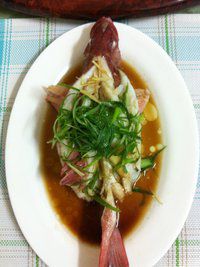 蒸好的鱼撒盐,姜葱丝,胡椒粉,酱油,把油烧滚浇在上面就好了