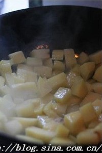 锅中放油,将土豆粒慢慢煎,稍后翻面再煎,这样做土豆烧熟后更美味