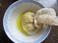 3、面团和馅料中都放了姜汁,不仅能中和海带的寒性,而且姜的味道和海带也很搭。如果没有磨姜盘,可以把姜切碎再取汁;