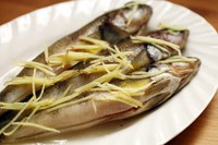 鱼身内外抹上盐、料酒,撒上姜丝,鱼肚子里也塞一些。腌制一刻钟。