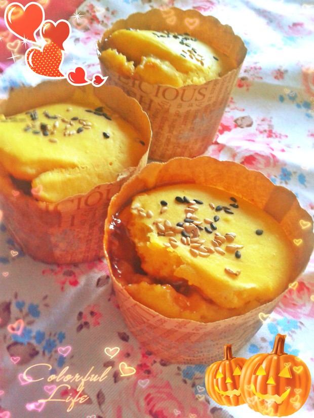 方子改自山本路子的かぼちゃあん入り?かぼちゃのマフィン,纯素且热量很低,3个中杯每个200卡左右。馅料和装饰可随意换,很灵活。