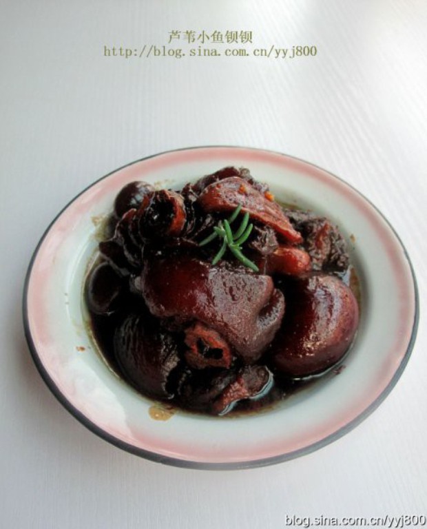 猪蹄切块(可以整个下),在开水中焯去血水,用清水洗去多余的浮沫,再入开水再煮20分钟左右.焖一会儿