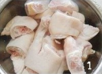 锅入冷水,将猪蹄儿放入,水开后煮5分钟,将猪蹄洗净取出凉透备用