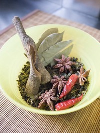 准备好食材:姜片、干辣椒、桂皮、香叶、八角。