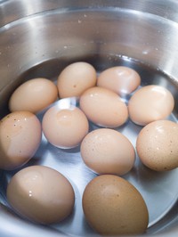 开煤气,大火煮开转中小火煮,不要一直用大火哈,鸡蛋容易裂开。煮熟后用冷水冲,这样好剥壳。
