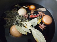 把鸡蛋、姜片、干辣椒、花椒、桂皮、香叶、八角入电饭煲锅内,加适量水、放适量生抽、老抽。
