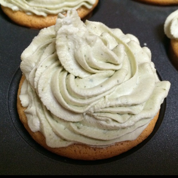 把白砂糖倒进淡奶油打发到偏干性,加入绿茶粉再打1分钟。裱花到蛋糕上