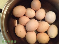 鸡蛋用凉水煮熟——大火煮开后继续煮5分钟,转中火10分钟,在关火捂5分钟,放入冷水下激;