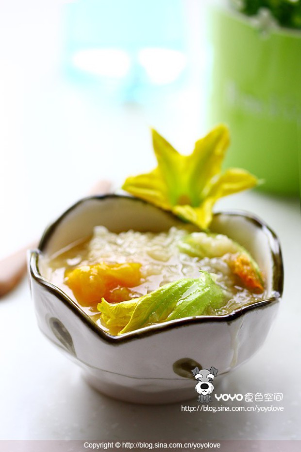 七月里来喝花粥【南瓜花粥的做法】。俺的早餐无论吃神马变幻的各种,一定要有的两样:粥和鸡蛋。鸡蛋我是吃不出任何味道,打小我就不稀罕那个味道,现在吃来就是因为补充营养。粥呢,我是真的稀罕,各种甜的、咸的、糯的、稀的,只要有粥吃,胃口就暖暖的,很满足。在诸多的快乐中,打底的一个,就是“满足”了:就像你不化妆冲出门,一定要有干净的头发;不带荷包就去逛街,一定要有能替你埋单的姐妹;没有准备的去见朋友,一定要有发自内心的微笑;不知道未来会是怎样,一定要有满满的信心......打底的,往往是最可靠的,它很平凡,但经得起考量。这个南瓜花粥,有软糯的南瓜,有娇嫩的南瓜花,它们本是食物不同阶段的同种,在七月的季节里,在花儿和果实同时存在的时间,让我们来喝一碗香香甜甜的南瓜花粥吧。
