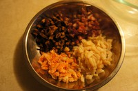 虾米、瑶柱、香菇泡发一夜备用。第二天可以把虾米、香菇切丁,瑶柱撕成丝;