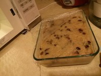 倒入刷好油的玻璃器皿,包保鲜膜,用刀尖在保鲜膜上捅8个孔,准备入微波炉;