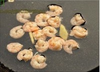 另取锅加入清水、生姜片煮开后,将腌制过的虾仁倒入焯水,虾变色成虾球即捞出漓去水份