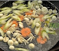 锅里清水煮开后,滴入少许橄榄油,然后将西芹片、胡萝卜片、菌菇分别倒入开水锅里,稍焯过水断生后捞出,在冷开水里冲凉漓干。(滴入橄榄油可以使原料色泽光鲜不变)